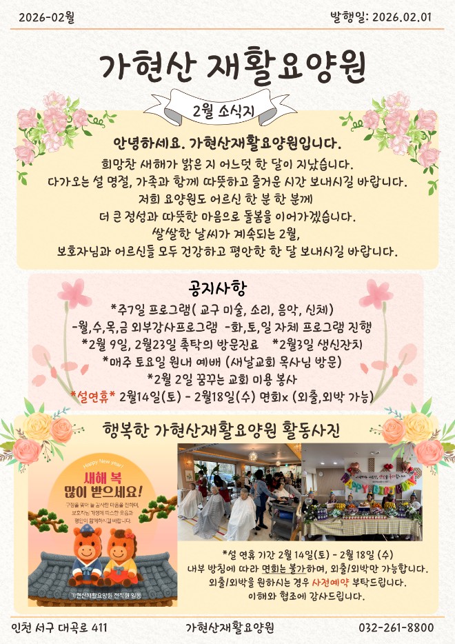 | 제목 | 2026년 가현산 재활요양원 2월 소식지입니다^^ | 공지일 | 2026.02.01 |